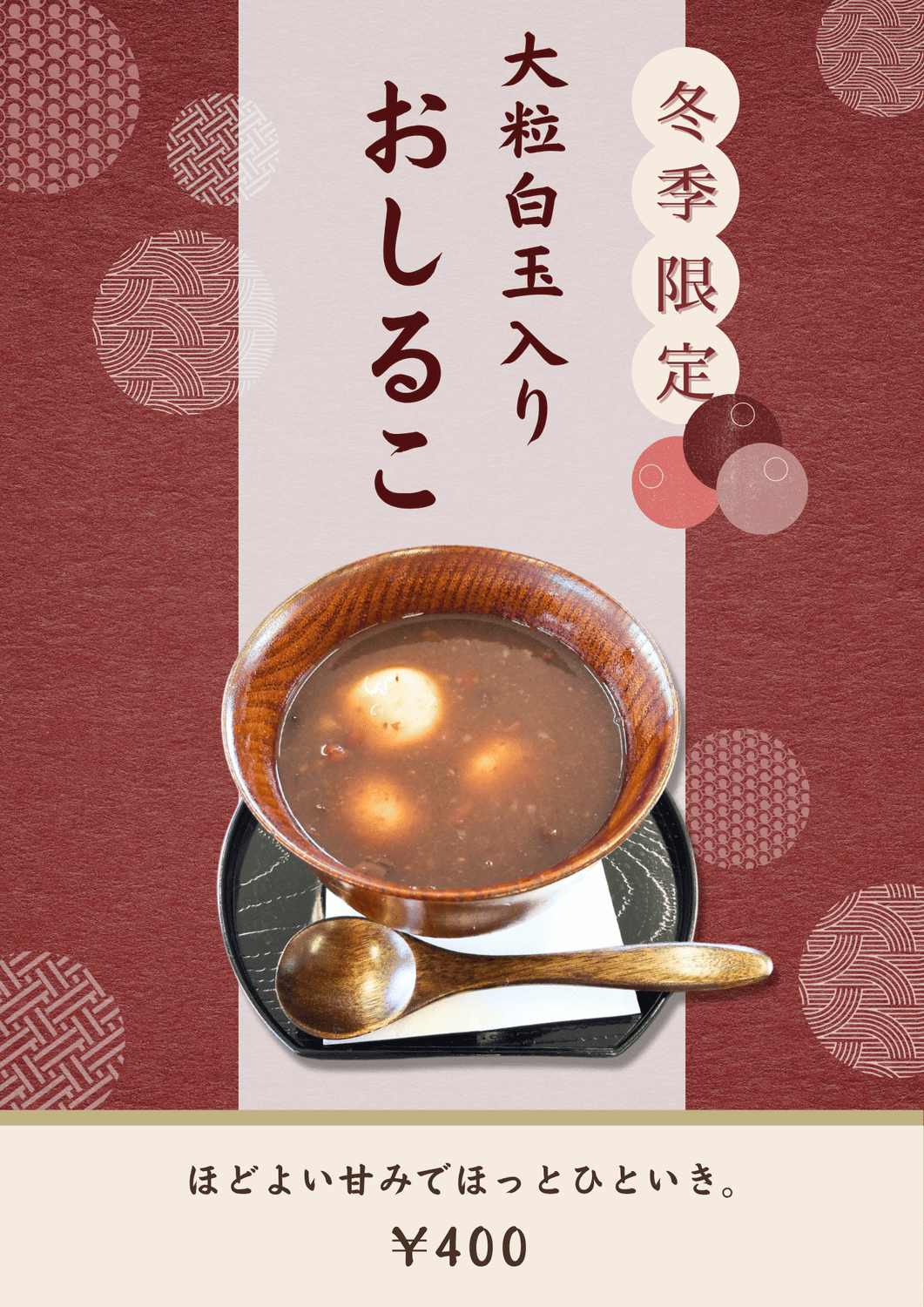 やさしい甘さのあずきに、もちもち食感の大粒白玉を浮かべました。心も体もあたたまる、ほっとする味わいをお楽しみください。